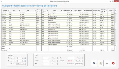 Overzicht onderhoudskosten per voertuig, met filter mogelijkheden per periode, debiteur, merk, type, euronorm, periode enz.